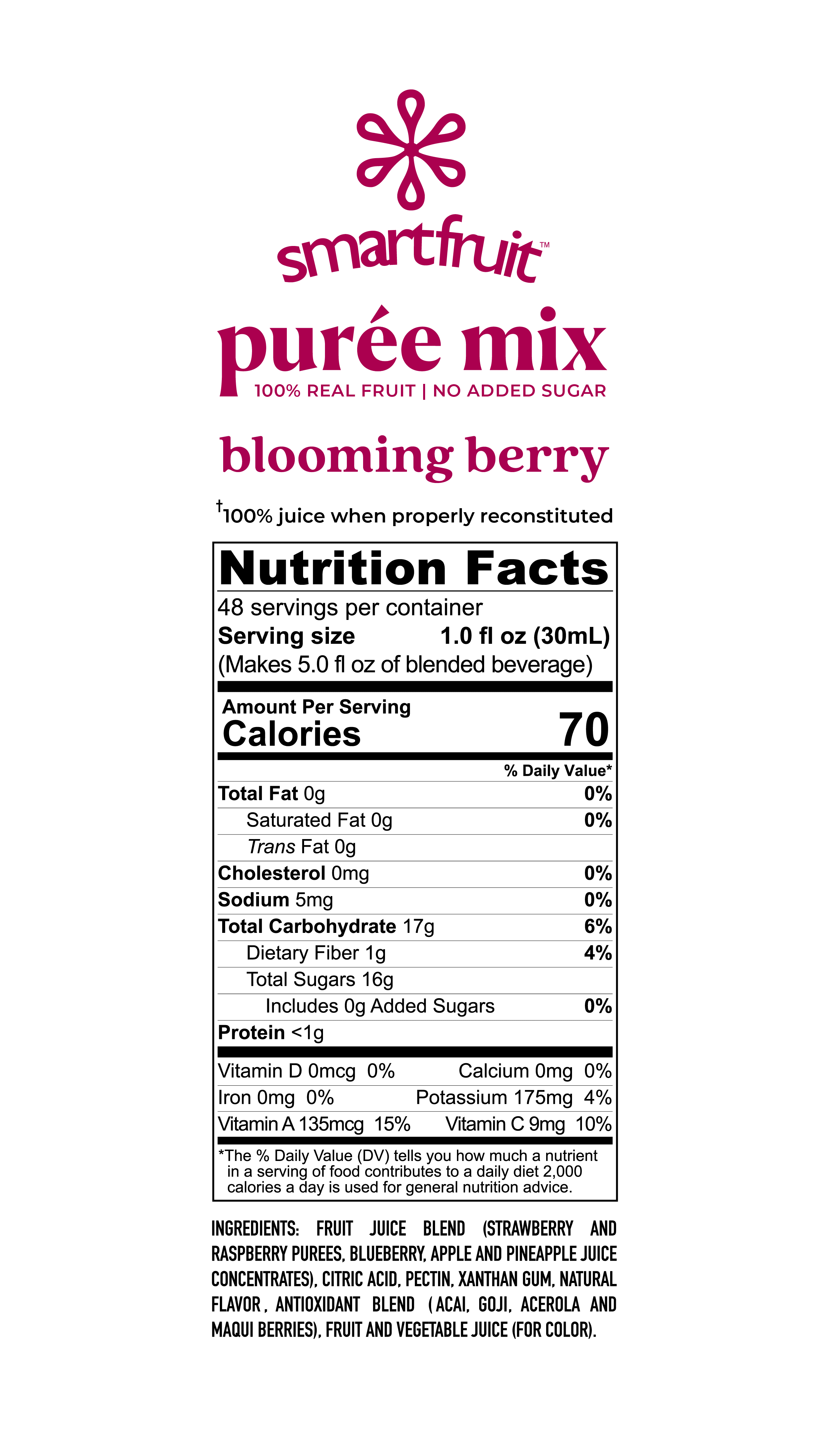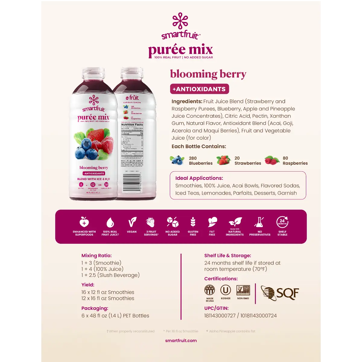 Smartfruit™ is an all natural 100% real fruit puree. Blend Smartfruit™ with ice to make a smoothie, mix it with water to make juice, top it on treats, shake it to make a cocktail, stir it, pour it, love it!