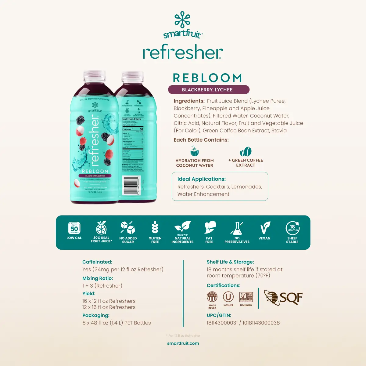 Introducing Smartfruit™ Rebloom Refresher, a invigorating blend of ripe, juicy blackberries with a bold, slightly tart sweetness, complemented with light floral lychee notes for a perfectly balanced finish. Each bottle is infused with hydrating coconut water, rich in electrolytes, essential vitamins, and minerals. We’ve also added green coffee bean extract to give a natural boost of energy and focus without the coffee taste. Sticking to the Smartfruit tradition, there is NO added sugar, and each serving is only 50 Calories so you can shake off the guilt of having more than one cup! Simply add H₂O and ice to your shaker and get ready to serve up the perfect real fruit refresher.