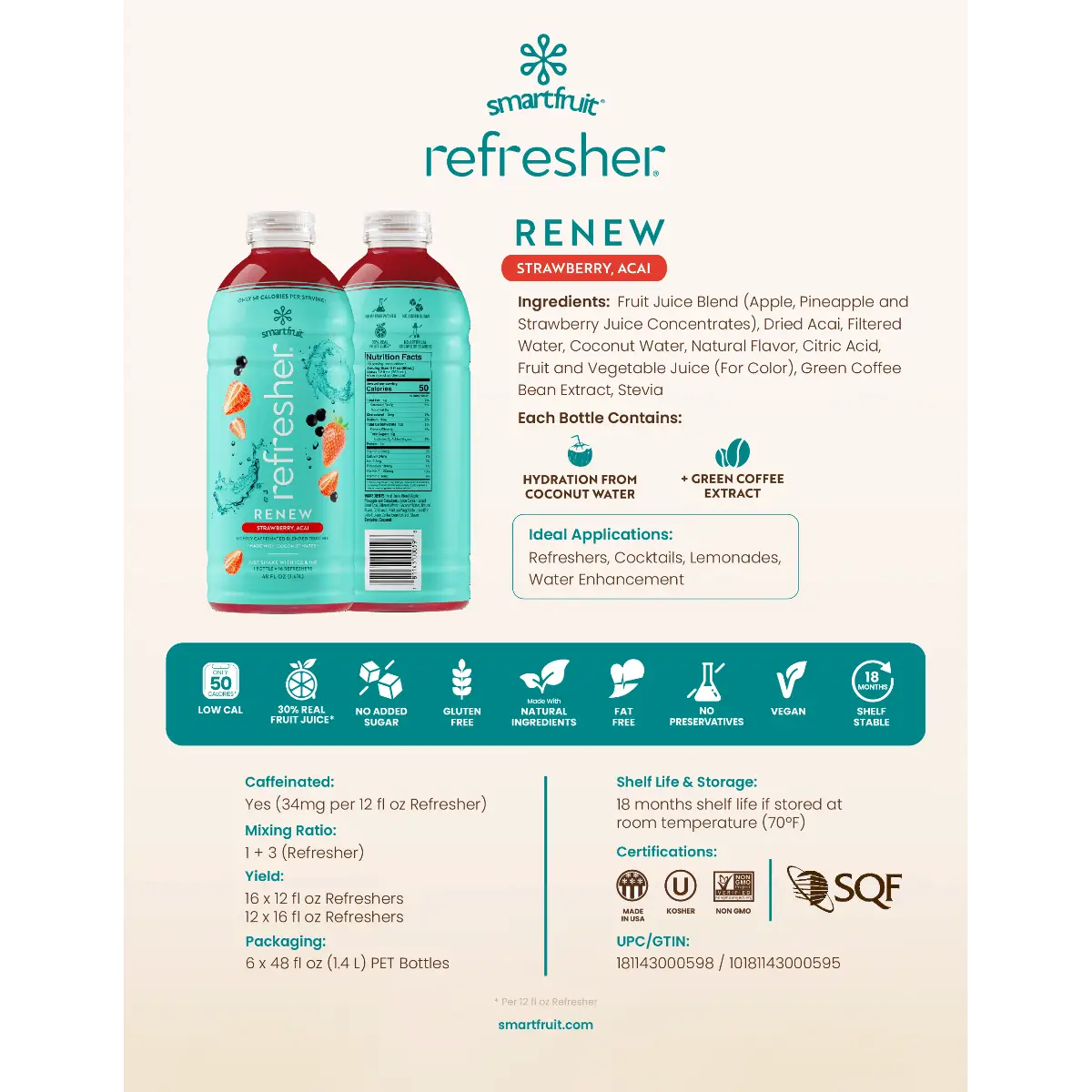 The hot summer month represents a time of vitality when the whole world is basking in the energy that blossomed during spring. Meet Smartfruit Renew, the ultimate drink to gracefully beat the heat as things warm up. A blend of sun-kissed strawberries and super-healthy acai berries coming together to provide you with renewal of your body and pallet needs. Each bottle is infused with hydrating coconut water, rich in electrolytes, essential vitamins, and minerals. We’ve also added green coffee bean extract to give a natural boost of energy and focus without the coffee taste. Sticking to the Smartfruit tradition, there is NO added sugar, and each serving is only 50 Calories so you can shake off the guilt of having more than one cup! Simply add H₂O and ice to your shaker and get ready to serve up the perfect real fruit refresher.